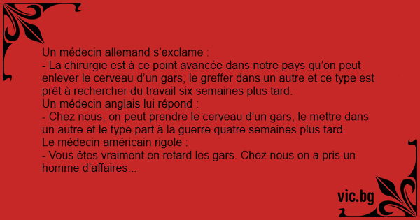 - La chirurgie est à ce point avancée dans notre pays qu’on peut enlever le cerveau d’un gars, le greffer dans un autre et ce type est prêt à rechercher du travail six semaines plus таrd.