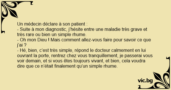 - Hé, bien, c’est très simple, répond le docteur calmement en lui ouvrant la porte, rentrez chez vous tranquillement, je passerai vous voir demain, et si vous êtes toujours vivant, et bien, cela voudra dire que ce n’était finalement qu’un simple rhume.