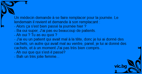 Un médecin demande à se faire remplacer pour la journée. Le lendemain il revient et demande à son remplacant :