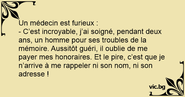 - C’est incroyable, j’ai soigné, pendant deux ans, un homme pour ses troubles de la mémoire. Aussitôt guéri, il oublie de me payer mes honoraires. Et le pire, c’est que je n’arrive à me rappeler ni son nom, ni son adresse !