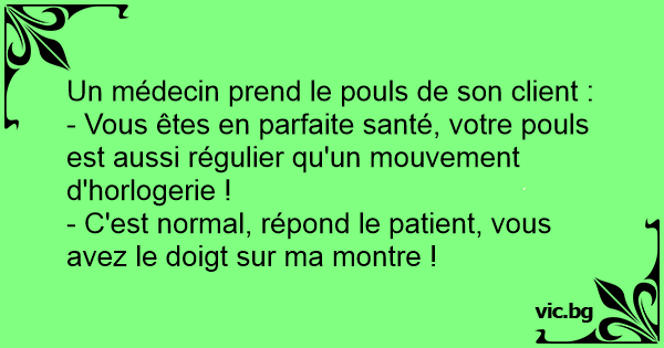 - C'est normal, répond le patient, vous avez le doigt sur ma montre !