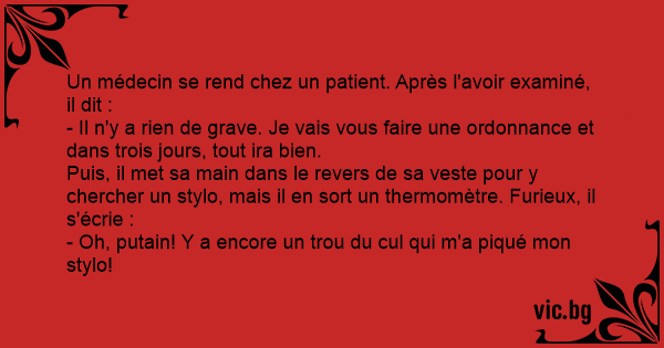Dokter tot verpleegster : Geef mij eens een voorschriftformulier. Verpleegster : Maar dokter, U schrijft met de koortsthermometer. Dokter : Ga dan eens kijken in wiens achterste mijn stylo steekt.