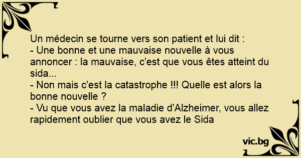 - Une воnnе et une mauvaise nouvelle à vous annoncer : la mauvaise, c'est que vous êtes atteint du sida...