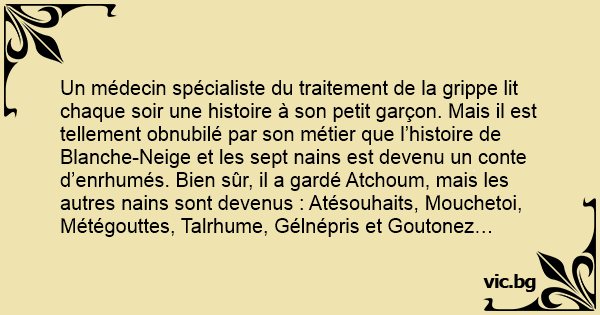Un médecin spécialiste du traitement de la grippe lit chaque soir une histoire à son petit garçon. Mais il est tellement obnubilé par son métier que l’histoire de Blanche-Neige et les sept nains est devenu un conte d’enrhumés. Bien sûr, il a gardé Atchoum, mais les autres nains sont devenus : Atésouhaits, Mouchetoi, Métégouttes, Talrhume, Gélnépris et Goutonez…