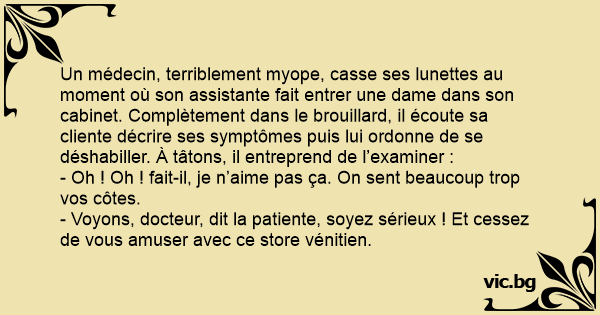 - Voyons, docteur, dit la patiente, soyez sérieux ! Et cessez de vous amuser avec ce store vénitien.