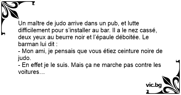 Un maître de judo arrive dans un pub, et lutte difficilement pour s’installer au bar. Il a le nez cassé, deux yeux au beurre noir et l’épaule déboitée. Le barman lui dit :