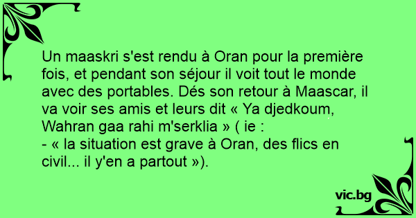 Un maaskri s'est rendu à Oran pour la première fois, et pendant son séjour il voit tout le monde avec des portables. Dés son retour à Maascar, il va voir ses amis et leurs dit « Ya djedkoum, Wahran gaa rahi m'serklia » ( ie :