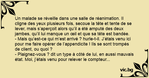 - Mais qu’est-ce qui m’est arrivé ? hurle-t-il. J’étais venu ici pour me faire opérer de l’appendicite ! Ils se sont trompés de client, ou quoi ?