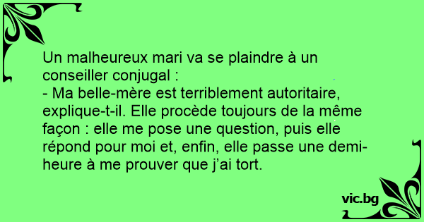 - Ma belle-mère est terriblement autoritaire, explique-t-il. Elle procède toujours de la même façon : elle me pose une question, puis elle répond pour moi et, enfin, elle passe une demi-heure à me prouver que j’ai tort.