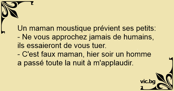 Λέει η μαμά στο παιδί κουνουπάκι : - Μην πλησιάζεις πόλυ τους ανθρώπους, επειδή δεν μας χωνεύουν καθόλου! - Μα τι λες βρε μαμά; Αφού κάθε φορά που περνάω από δίπλα τους, αυτοί με χειροκροτούν!