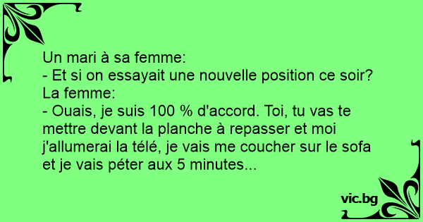 Ægteparret Manden: “Skal vi ikke prøve en anden stilling i aften?” Konen: “Ok, du står her og stryger, mens jeg sidder i sofaen og prutter.”