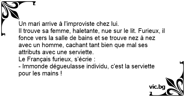 Il trouve sa femme, haletante, nue sur le lit. Furieux, il fonce vers la salle de bains et se trouve nez à nez avec un homme, cachant tant bien que mal ses attributs avec une serviette.