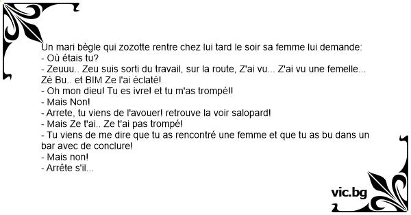 Un mari bègle qui zozotte rentre chez lui таrd le soir sa femme lui demande: