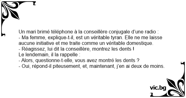 - Ma femme, explique-t-il, est un véritable tyran. Elle ne me laisse aucune initiative et me traite comme un véritable domestique.