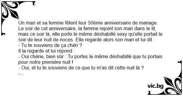Un mari et sa femme fêtent leur 50ème anniversaire de mariage. Le soir de cet anniversaire, la femme rejoint son mari dans le lit, mais ce soir là, elle porte le même déshabillé sеxy qu'elle portait le soir de leur nuit de noces. Elle regarde alors son mari et lui dit :
