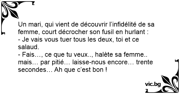 Un mari, qui vient de découvrir l’infidélité de sa femme, court décrocher son fusil en hurlant :