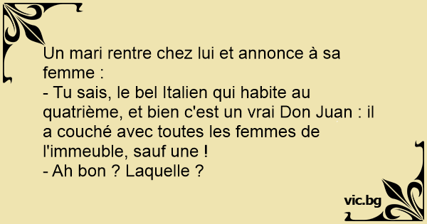 - Tu sais, le bel Italien qui habite au quatrième, et bien c'est un vrai Don Juan : il a couché avec toutes les femmes de l'immeuble, sauf une !