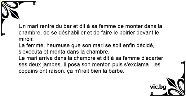 Le mari arriva dans la chambre et dit à sa femme d'écarter ses deux jambes. Il posa son menton puis s'exclama : les copains ont raison, ça m'irait bien la barbe.