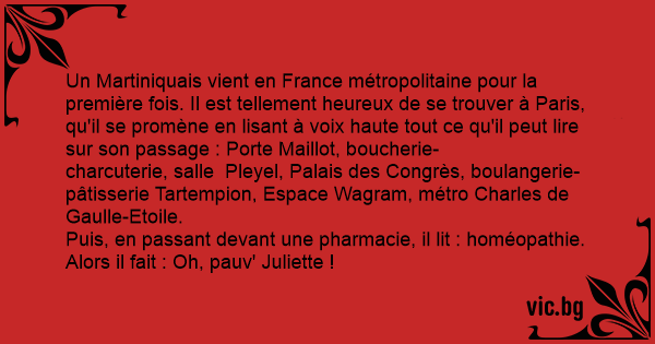 Puis, en passant devant une pharmacie, il lit : homéopathie. Alors il fait : Oh, pauv' Juliette !