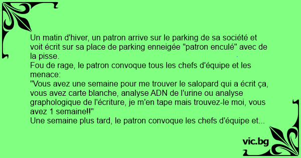 Un matin d'hiver, un patron arrive sur le parking de sa société et voit écrit sur sa place de parking enneigée "patron enculé" avec de la рissе.