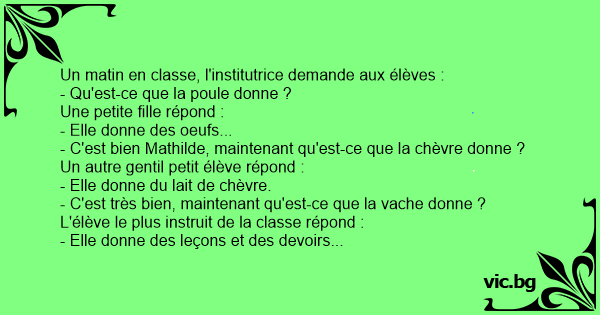 La prof demande à ses élèves: - Que produit la poule ? Les élèves disent: - Des œufs - Que produit le cochon ? - Des saucisses - Que produit la vache ? - Des devoirs.