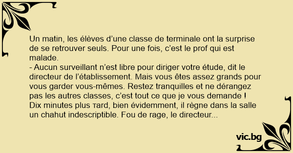 Dix minutes plus таrd, bien évidemment, il règne dans la salle un chahut indescriptible. Fou de rage, le directeur ouvre la porte à la volée, fonce dans la classe et saisit par le bras trois chahuteurs au hasard.