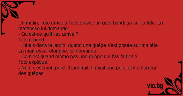 Une enfant arrive avec un bandage énorme sur la tête à l'école. La maîtresse voyant ça, demande à la fillette ce qu'il s'est passé. La fille dit: " Une guêpe m'a piquée... Et papa a pris une pelle pour la tuer."