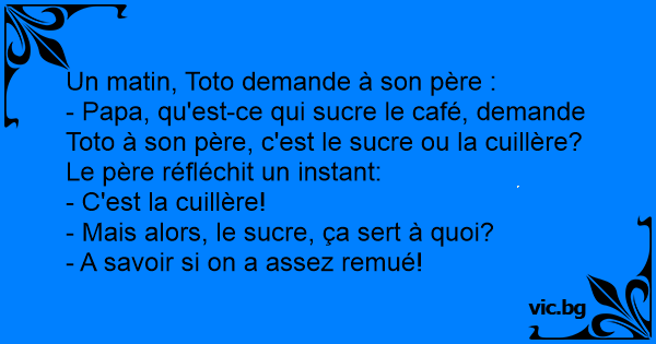 - Papa, qu'est-ce qui sucre le café, demande Toto à son père, c'est le sucre ou la cuillère?