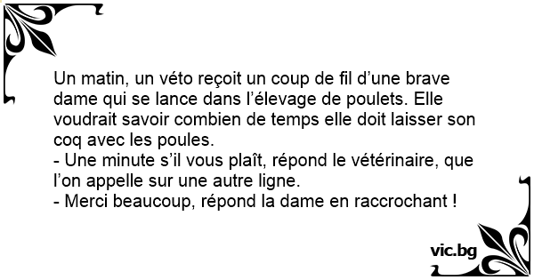 Un matin, un véto reçoit un coup de fil d’une brave dame qui se lance dans l’élevage de poulets. Elle voudrait savoir combien de temps elle doit laisser son coq avec les poules.