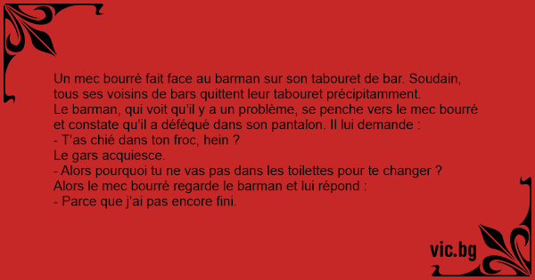 Le barman, qui voit qu’il y a un problème, se penche vers le mec bourré et constate qu’il a déféqué dans son pantalon. Il lui demande :