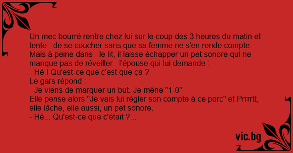 Un mec bourré rentre chez lui sur le coup des 3 heures du matin et tente de se coucher sans que sa femme ne s'en rende compte. Mais à peine dans le lit, il laisse échapper un pet sonore qui ne manque pas de réveiller l'épouse qui lui demande :