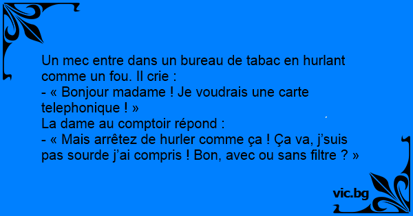 Un mec entre dans un bureau de tabac en hurlant comme un fou. Il crie :