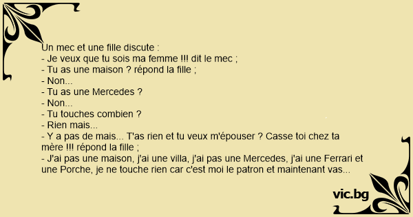 - Y a pas de mais... T'as rien et tu veux m'épouser ? Casse toi chez ta mère !!! répond la fille ;
