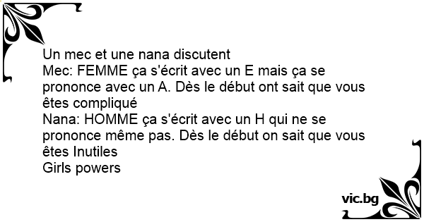 Mec: FEMME ça s'écrit avec un E mais ça se prononce avec un A. Dès le début ont sait que vous êtes compliqué