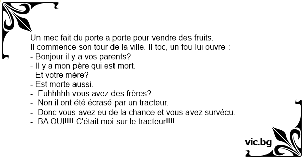 Un mec fait du porte a porte pour vendre des fruits. Il commence son tour de la ville. Il toc, un fou lui ouvre :