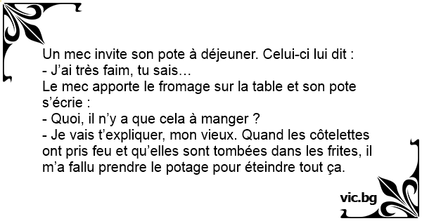 - Je vais t’expliquer, mon vieux. Quand les côtelettes ont pris feu et qu’elles sont tombées dans les frites, il m’a fallu prendre le potage pour éteindre tout ça.