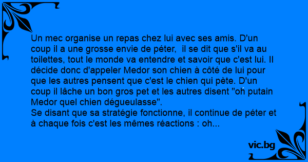 Un mec organise un repas chez lui avec ses amis. D'un coup il a une grosse envie de péter, il se dit que s'il va au toilettes, tout le monde va entendre et savoir que c'est lui. Il décide donc d'appeler Medor son chien à côté de lui pour que les autres pensent que c'est le chien qui pète. D'un coup il lâche un bon gros pet et les autres disent "oh рuтаin Medor quel chien dégueulasse".