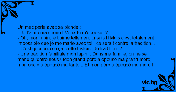 - Une tradition familiale mon lapin... Dans ma famille, on ne se marie qu'entre nous ! Mon grand-père a épousé ma grand-mère, mon oncle a épousé ma tante... Et mon père a épousé ma mère !