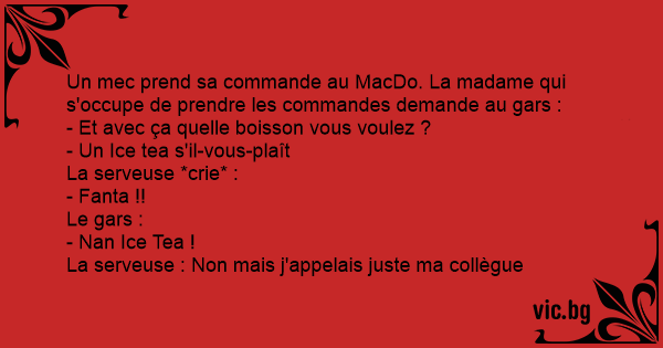 Un mec prend sa commande au MacDo. La madame qui s'occupe de prendre les commandes demande au gars :