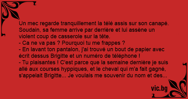 - Tu plaisantes ! C'est parce que la semaine dernière je suis allé aux courses hyppiques, et le cheval qui m'a fait gagné, s'appelait Brigitte... Je voulais me souvenir du nom et des numéro des chevaux à l'arrivée !
