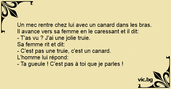 Un mec rentre chez lui avec un canard dans les bras. Il avance vers sa femme en le caressant et il dit: