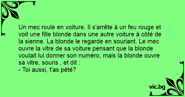 C'est un mec qui est dans sa voiture et il voit une jolie blonde à côté de lui ouvrir la fenêtre de sa voiture en souriant. Pensant qu'elle voulait lui demander son numéro, il ouvrit sa fenêtre à...