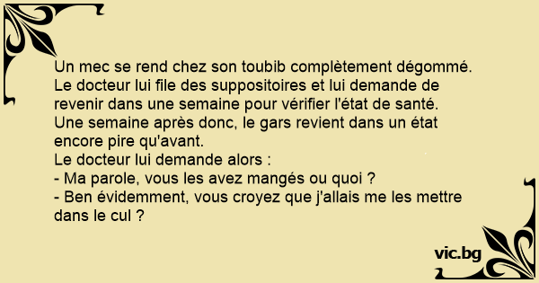 Le docteur lui file des suppositoires et lui demande de revenir dans une semaine pour vérifier l'état de santé.