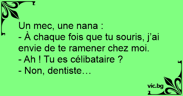 Hij: "Mevrouw, als u zo naar mij lacht, dan weet ik dat ik u binnenkort weer zie!" Zij: "Nou, u bent nog al overtuigd van uzelf!" Hij: "Nee, ik ben tandarts!"