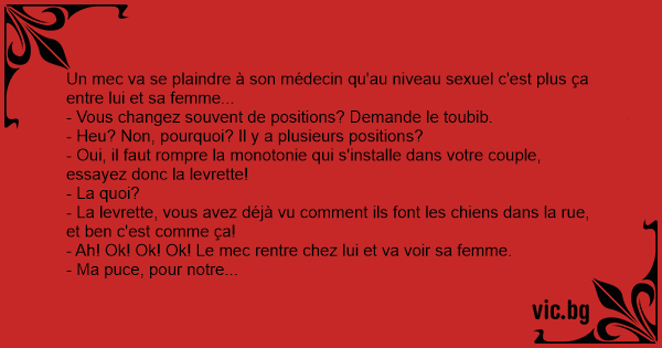 - Ma puce, pour notre libido le médecin m'a donné un truc, une nouvelle position: la levrette!
