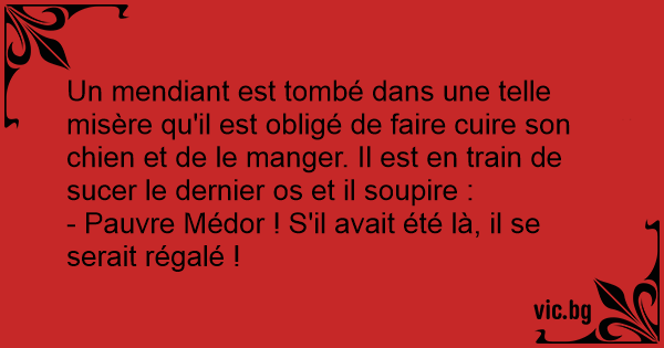 Un mendiant est tombé dans une telle misère qu'il est obligé de faire cuire son chien et de le manger. Il est en train de sucer le dernier os et il soupire :
