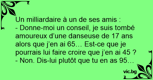 - Donne-moi un conseil, je suis tombé amoureux d’une danseuse de 17 ans alors que j’en ai 65… Est-ce que je pourrais lui faire croire que j’en ai 45 ?