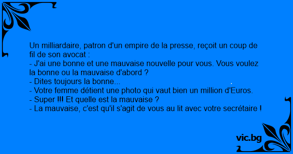 - La mauvaise, c'est qu'il s'agit de vous au lit avec votre secrétaire !