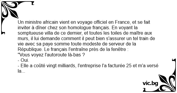 Un ministre africain vient en voyage officiel en France, et se fait inviter à dîner chez son homologue français. En voyant la somptueuse villa de ce dernier, et toutes les toiles de maître aux murs, il lui demande comment il peut bien s'assurer un tel train de vie avec sa paye somme toute modeste de serveur de la République. Le français l'entraîne près de la fenêtre :