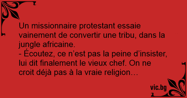 - Écoutez, ce n’est pas la peine d’insister, lui dit finalement le vieux chef. On ne croit déjà pas à la vraie religion…
